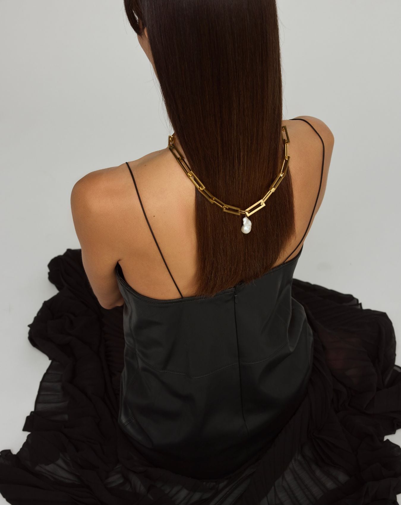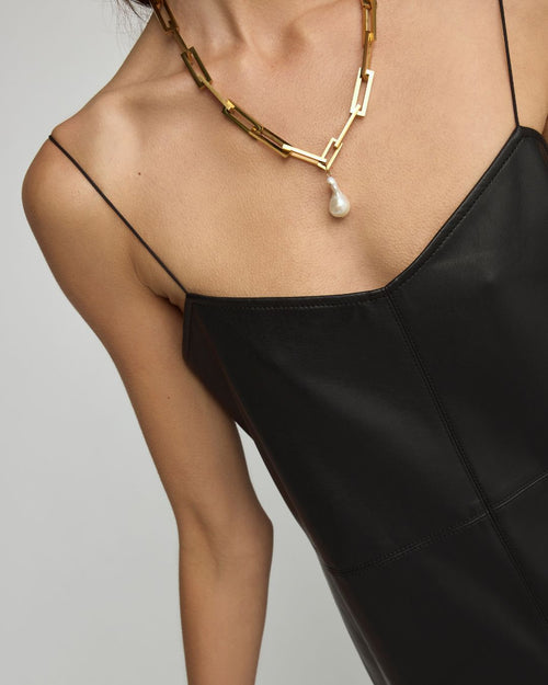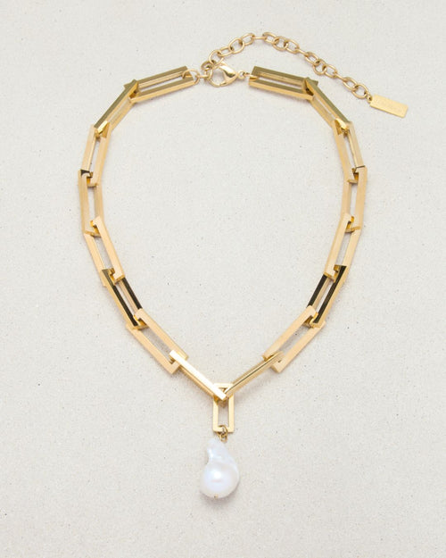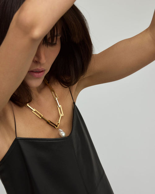 Our longtime love for freshwater pearls, combined with our new-found obsession with paperclip chains. The tarnish-free Terry necklace features sharp edges, falling to the natural fluidity of the real pearl charm.