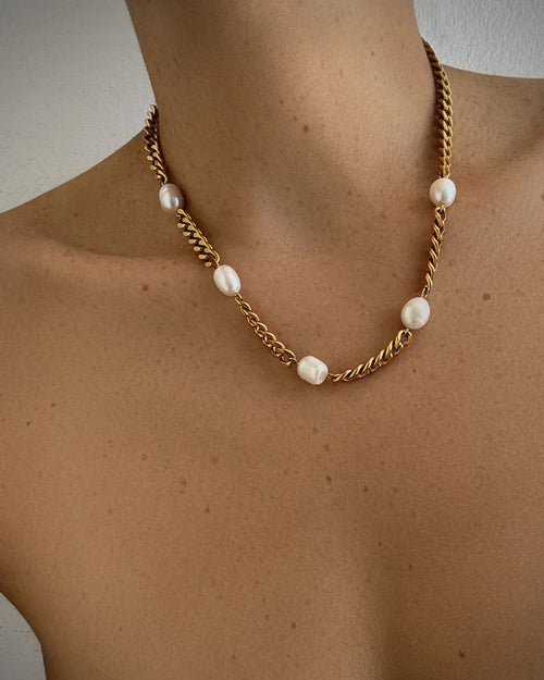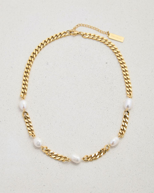 Freshwater pearls dotting the glossiest golden curb chain. Consider your day-to-night looks sorted.