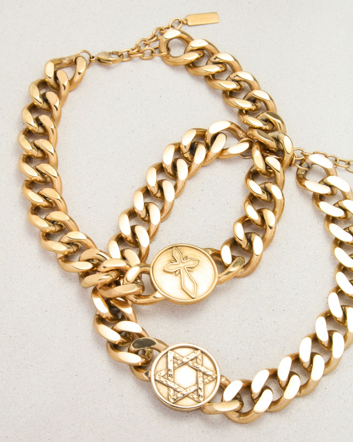 Beyond the time-worn finish of the Star of David coin, the ‘staying alive since BCE 1200’ engraving on the back of the coin adds yet another layer of storied inspiration to the oversized curb chain. Wear it proudly.