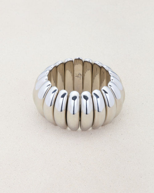 A timeless maximalist, the fluted Baroque bracelet wears equally well on its own or stacked. Curved to catch the light from every angle, its wide, silver-plated silhouette never goes unnoticed…whilst fitting like a glove with its stretch base.