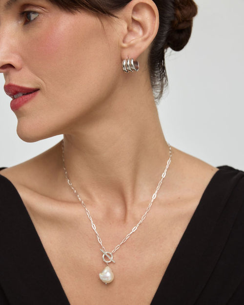 Our smallest hoop earrings yet, the silver Guggenheim re-explores a classic style with fluted details and an open end that lends it a huggie-like fit. Especially sleek alongside one of our pearl necklaces.