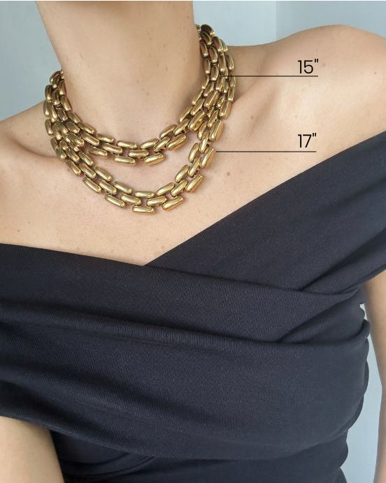 The 15" Phoebe necklace is meant to be worn as a collar high up on the neckline, gracing the collarbone. The 17" version is a true necklace length. The fit will depend on the width of your neckline.