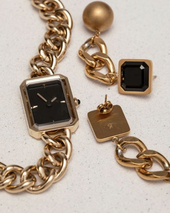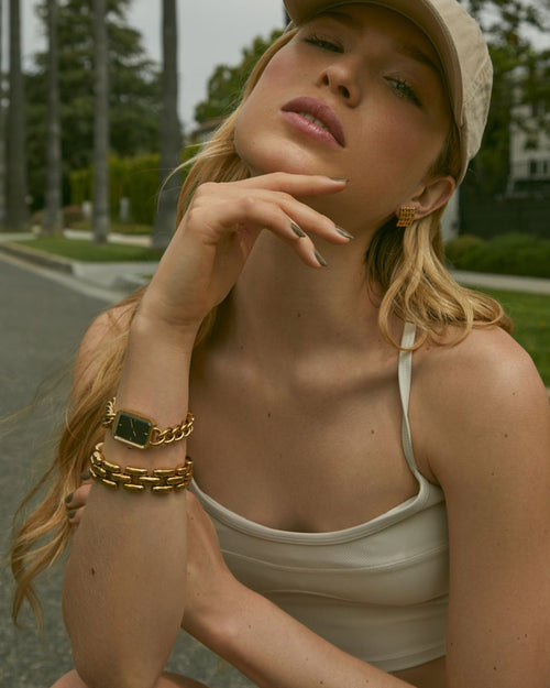 Checking the time never felt this good. You'll be both fashionable and not late. The minimalistic design of the geometric watch face balances perfectly with the bold chunky links of the bracelet. Wrapped in 18k gold plating, it will get you to where you need to go in the chicest way possible.